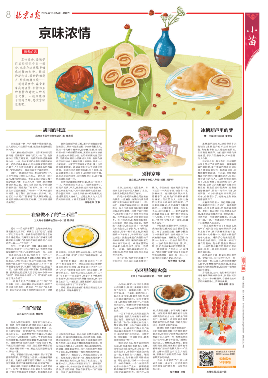 京味美食,是孩子们成长记忆中的一部分,也是与这座城市情感连接的纽带。软糯的驴打滚、酸甜的糖葫芦、朴实的糖火烧……一道道美食中,蕴含着家庭的温情、街坊邻里的热情和对故人的思念之情。一起跟随孩子们的文字,感受京味浓情吧。